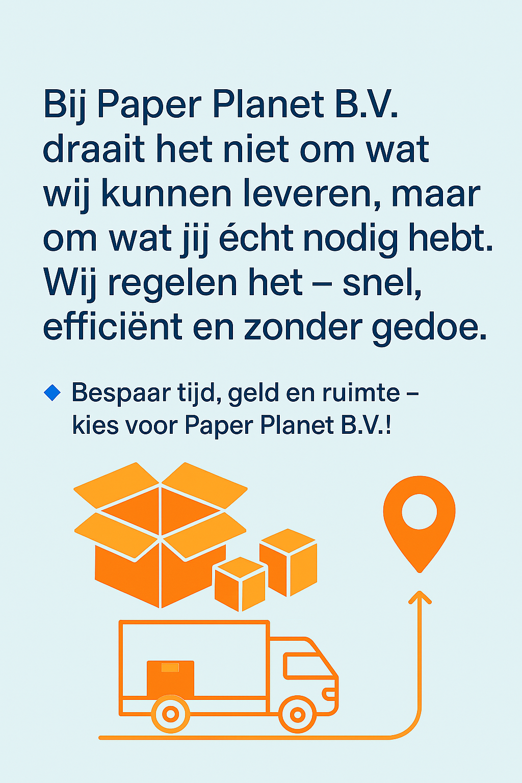 Bedrijven kiezen voor Paper Planet B.V. omdat wij het volledige verpakkingsbeheer uit handen nemen. Eén aanspreekpunt betekent minder gedoe, minder kosten en meer tijd voor jouw corebusiness.